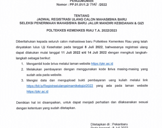 BeritaBerita Jadwal Registrasi Ulang Calon Mahsiswa Baru Seleksi Penerimaan Mahasiswa Baru Jalur Mandiri Kebidanan & Gizi Poltekkes Kemenkes Riau T.A 2022/2023 On 8 Jul 2022 Share FacebookTwitterWhatsAppLinkedinPrint
