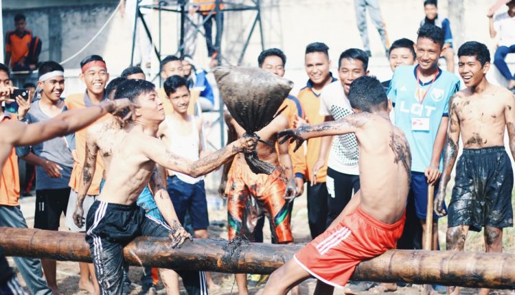 Ketika melakukan gebuk bantal, para peserta harus tetap bertahan agar menjadi pemenang.