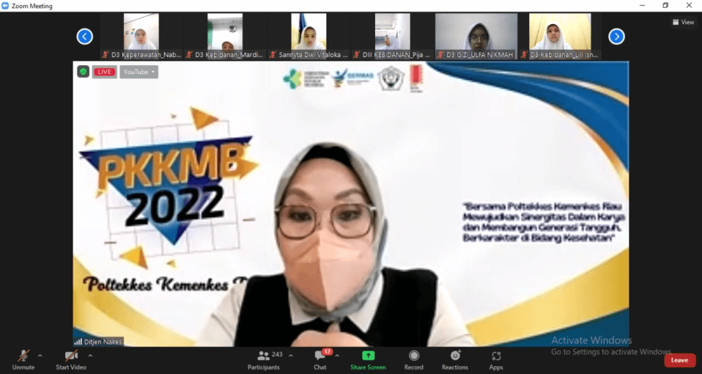 Materi tersebut diberikan baik oleh pihak Internal Poltekkes Kemenkes Riau maupun dari instansi terkait seperti Dirjen vokasi, Dinkes Prov, BNN, Polsek ,Motivator, IBI, PPNI, PERSAGI dan alumni