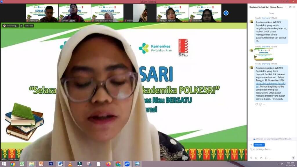 Poltekkes Kemenkes Riau Kembali mengadakan Kegiatan SERBUK SARI (Selasa Rembuk Buku Civitas Akademika Polkesri) pada hari Selasa, 19 November 2024. Ada yang menarik dari Serbuk Sari kali ini karena dibawakan langsung dengan baik oleh MC Duta Baca dari Mahasiswa, Amallya Kartika. Narasumber rembuk buku berasal dari Pegawai Bagian Keuangan, Ibu Lismawarni Simamora, SE dengan buku berjudul Organisasi Motivasi : Dasar Peningkatan Produktivitas karya Drs.H. Malayu S.P Hasibuan