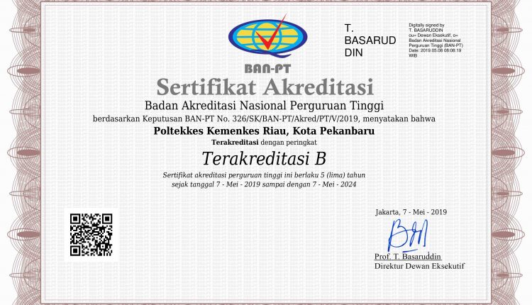 BeritaBerita SERTIFIKAT AKREDITASI BAN-PT Last updated 10 Mei 2019 Sertifikat Akreditasi BAN-PT menyatakan bahwa Poltekkes Kemenkes Riau terakreditasi B, dimana pelaksanaan assesment lapangan dilakukan pada tanggal 28-30 April 2019 Share FacebookTwitterWhatsAppLinkedinPrint